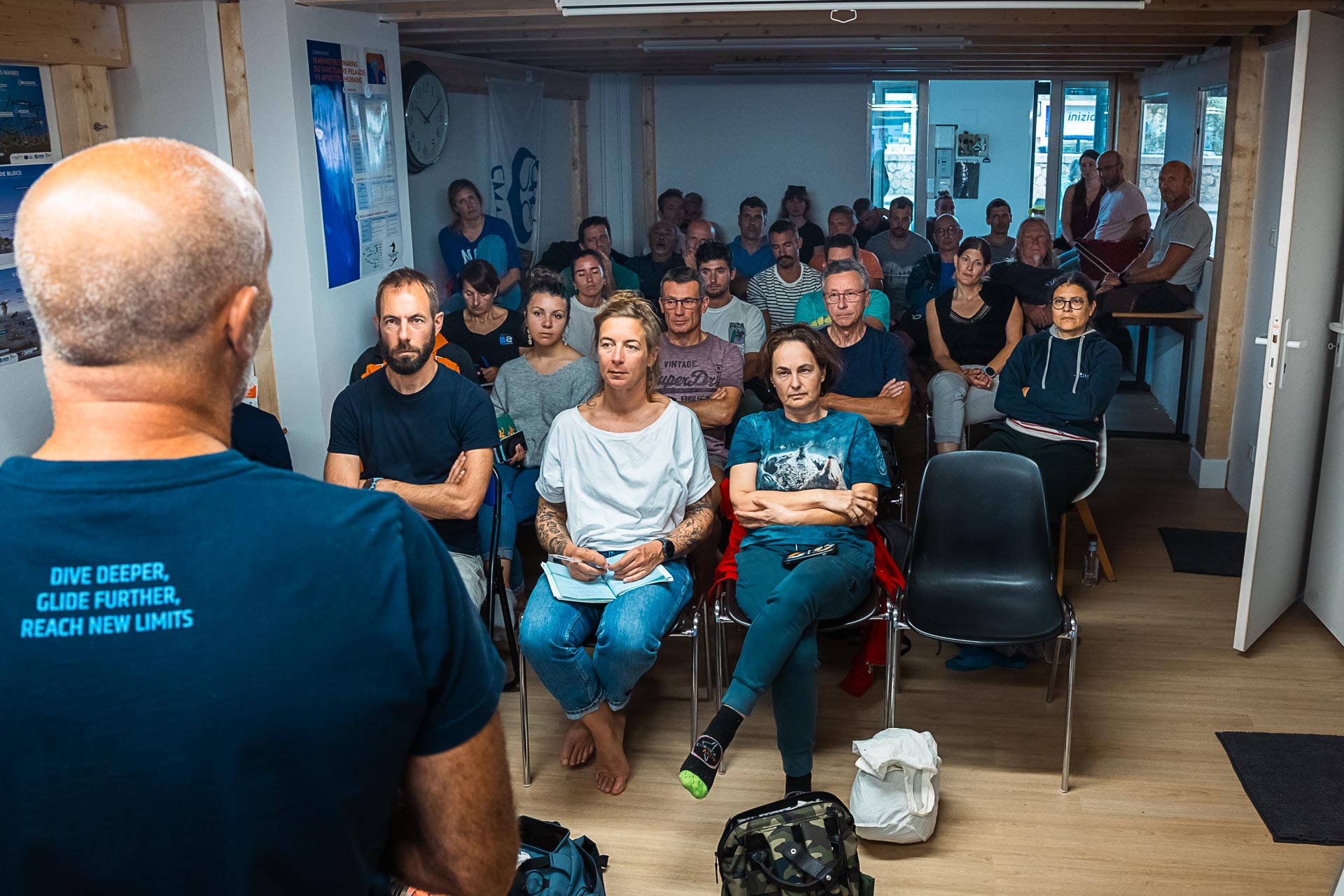 Chaque journée alterne sessions en mer, ateliers techniques, échanges et rencontres. Certains découvrent la profondeur, d’autres travaillent une discipline précise, et une partie se forme à être safety ou juge en compétition.